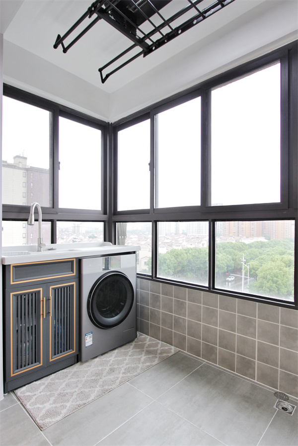陽臺與客廳無移門隔絕,目的是為了讓客廳空間更加通透,塑造更為開放的居室。定制陽臺柜兼具盥洗功能,滾筒洗衣機完美嵌入其中,抽拉式水龍頭使用起來更加方便。