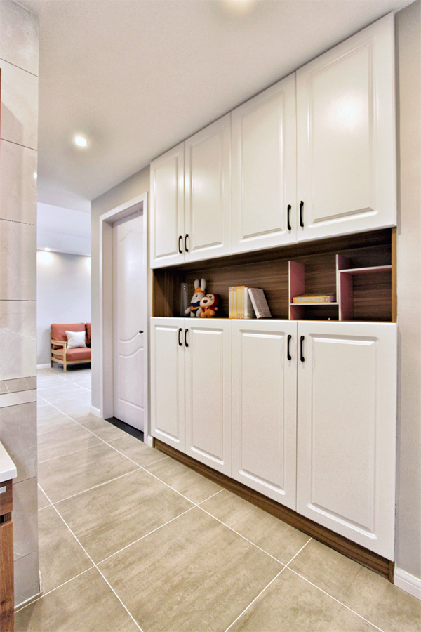 走廊空間毫無分界感,通鋪地磚,以筒燈為引,往室內延伸。一側墻體做收納柜,中腰留空,集收納與展示與一體,與全屋風格一致的白色柜門,在視覺上更令人舒心。