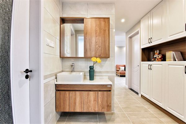 設計師利用走廊轉角處,開辟出衛生間干區,滿足一家人對衛生間功能的需求。干區與室內整體裝飾搭配,采用原木風格,鏡柜組合加強收納,臺上盆設計更加美觀。衛生間內利用淋浴房進行干濕分離,小小的空間,滿足多重需求。