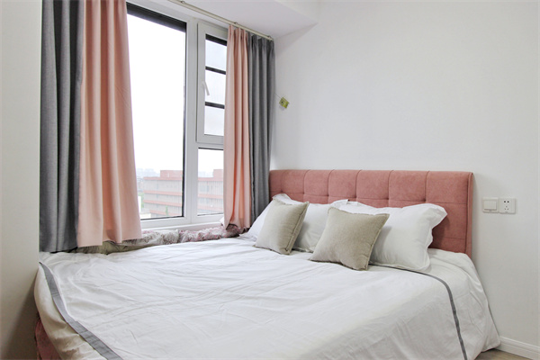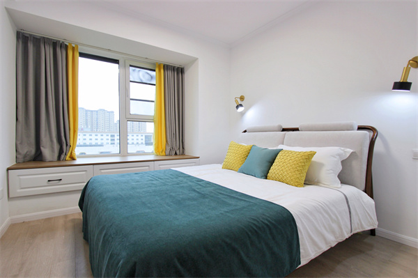 主臥以簡約為主,墻面粉刷白色塑膠漆,素雅干凈,飄窗臺定制收納抽屜,增加儲物。床頭兩側安裝可調節壁燈,集中床頭光源,飄窗臺亦可充當床頭柜的角色,無床頭柜的設計使空間不那么擁擠。