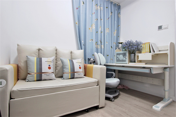 在有限的空間中,開辟出一塊學習空間,書桌提供學習功能,而小沙發拉出后也兼顧了客房功能。設計師充分將每一個空間功能發揮到極致,即使是小小書房,也擁有整面墻的儲物空間。