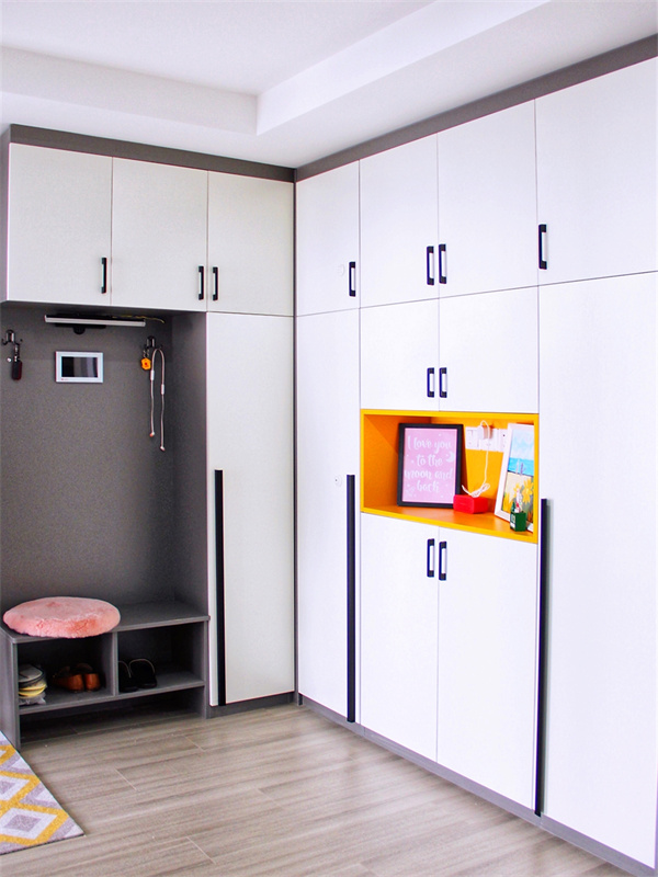 入戶玄關收納日常瑣碎,白色的柜面簡約而大方。嵌入式換鞋凳,既省空間,又是整體統一和諧,掛鉤設計提醒主人出門不要忘記帶鑰匙。