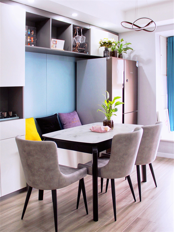 這里充分體現了空間的合理規劃,卡座式餐廳節省空間,并增加了收納空間,冰箱旁的飄窗設計,使房子里多了一處休閑空間,一抬眼,湖景盡收眼底。