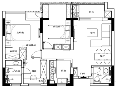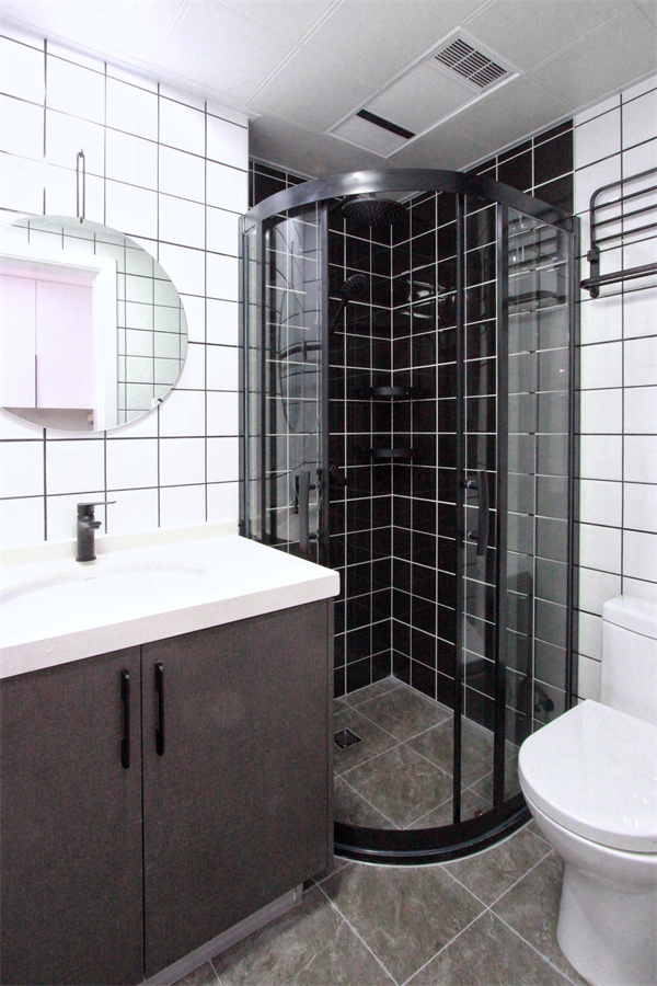 外衛采用黑白調色彩,注入時尚元素,利用黑白區分干濕兩區,格局明確。內衛將浴室柜收納做大,馬桶旁設置開放格,方便拿取。