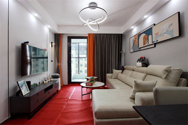 電視機墻面使用石膏線,兩邊的壁燈造型獨特,讓靜謐的夜晚更加溫馨。高低圓形茶幾使客廳空間更加整體,橙灰拼接窗簾增加空間韻律感,墻體采用水泥灰與白色墻面漆讓空間更加沉穩,簡單的拼接色彩,讓整體空間看起來時尚而低調。