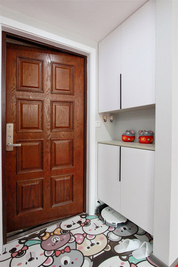 房屋大門外開,節省室內空間,玄關柜屹立入門處,中空展示柜放上獨特的小物件,也能放些隨手物件,卡通地墊充滿童心,鞋柜下方留空,方便進出換鞋。
