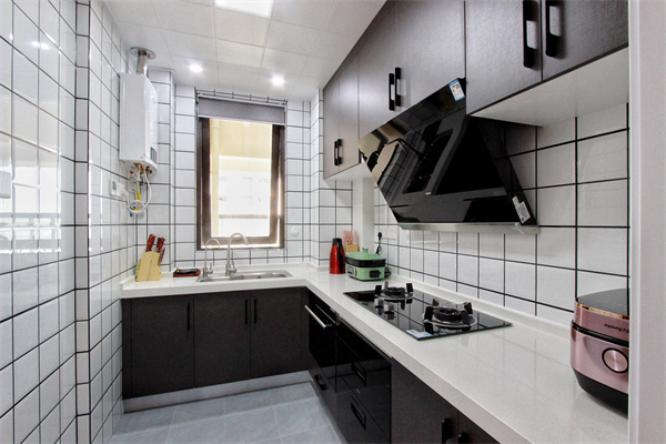 明亮、開闊的廚房會讓做飯的人擁有好心情。小方格造型墻磚增加空間動感,黑色櫥柜穩重大氣,L形廚房充分利用空間,再也不會雜亂無章。