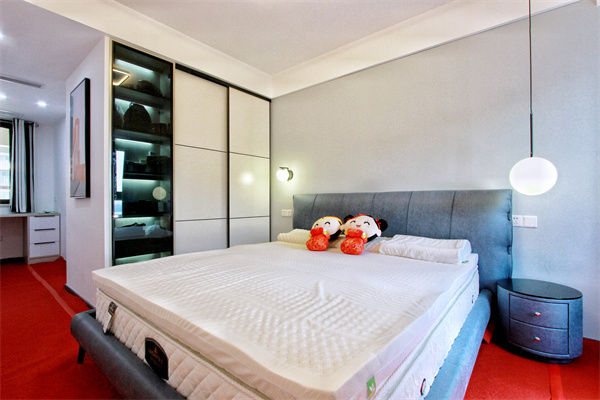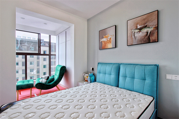 次臥采用單邊床頭柜,充分利用空間,床頭掛畫也是貓咪畫像,清新而溫柔。入門衣柜讓外界與室內形成一個過渡設計師將小小空間合理安置,中央空調美觀且節約空間。