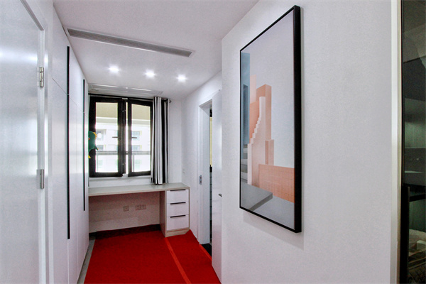 入門的另一端則是小書桌與衛生間,正面墻的衣柜將所有衣物整潔收納,同時又與墻面形成整體。