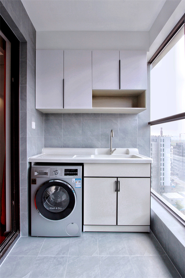 整面落地窗是空間通透明亮,功能性陽臺將洗衣晾曬安置于此,收納柜設計開放格,放上常用物品,整體為純凈的白色調。