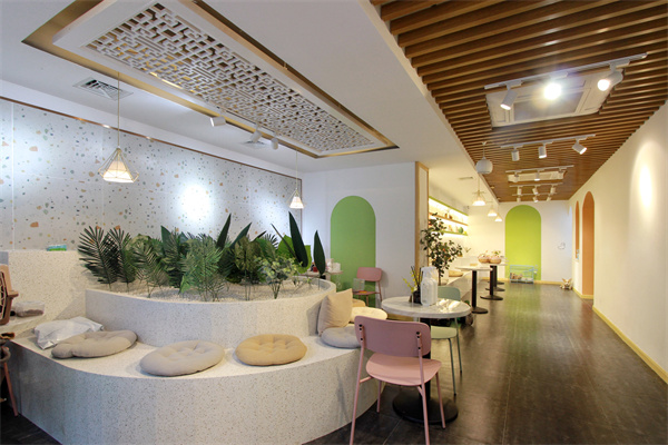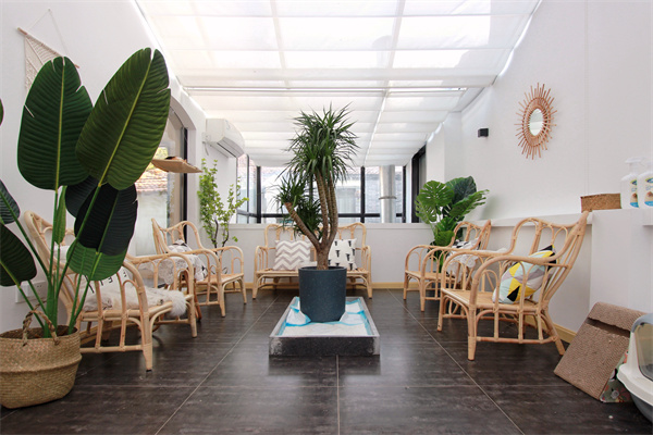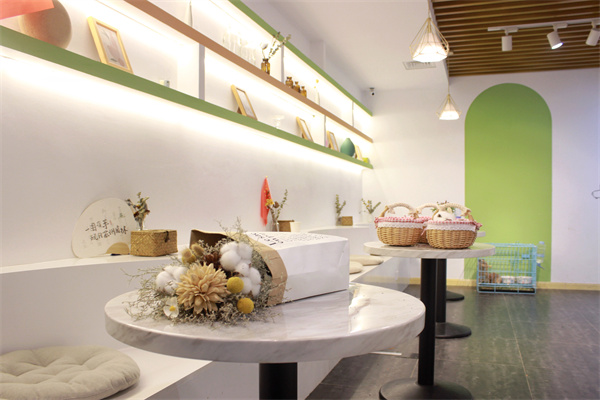 寬敞的大廳空間讓小動物們有足夠的活動場所,悠閑又自在。綠植的介入,讓人仿佛坐在大自然中,與小動物們親密接觸。靠墻設(shè)置卡座,懷里抱著小兔子,腳邊小狗狗在奔跑,羊駝悠閑的吃著胡蘿卜,咖啡都變得格外香醇。