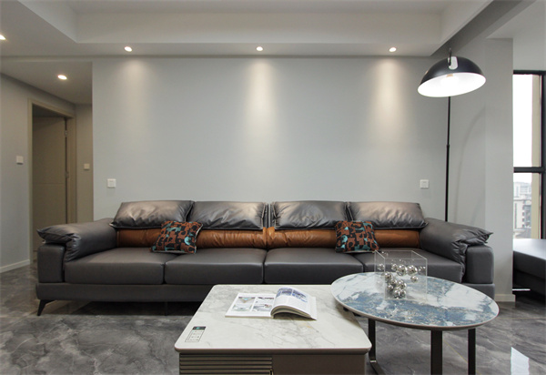 不落俗套的深灰色沙發加以棕、藍、黑三色抱枕的裝點,極簡沙發的皮質外配以現代圓形+正方形雙拼茶幾桌,碰撞出特別的氣場。