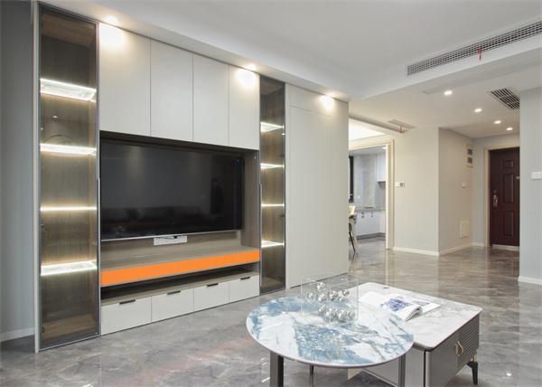 電視背景墻設置了一整面的電視柜,兩排玻璃柜暗藏燈帶,滿足了日常生活中對收納的需求,又十分的大氣和上檔次。沙發邊佇立的臺燈提升空間精致感,起到了很好的裝飾作用,細節滿分。