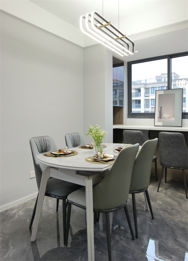 餐廳的整體搭配簡潔自然,小空間與餐桌的尺寸簡直量身打造,非常融洽,鮮花和裝飾畫也很好的點綴了這一方小天地。灰白輕奢餐桌椅,配以造型別致的吊燈,冷酷而不失時尚感,柔和的燈光灑下來,讓用餐更具情調感。