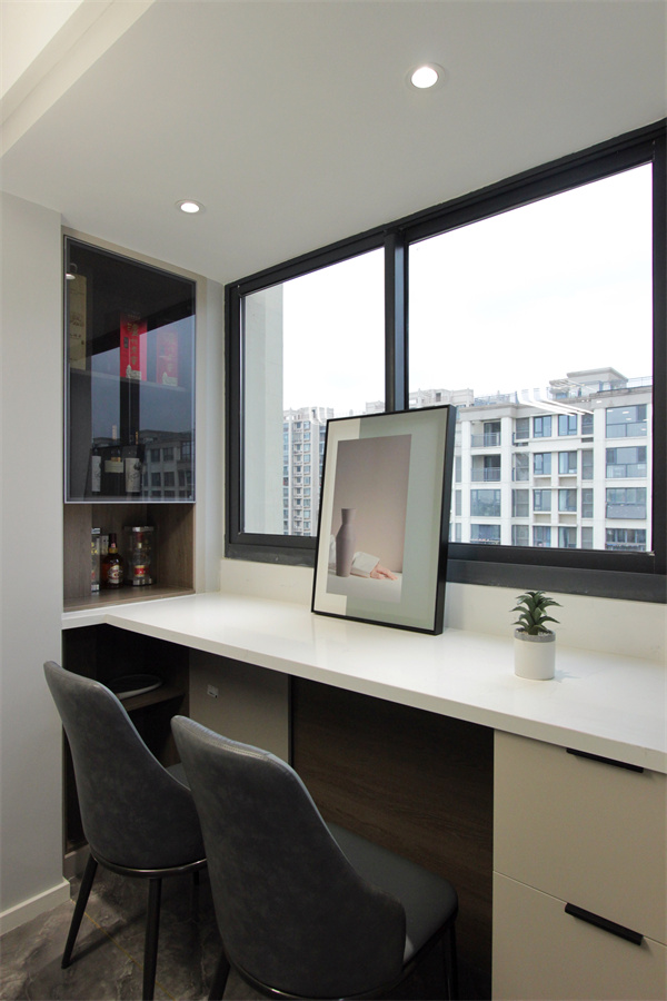 酒水架與木質桌做了一體化設計,既可以充當吧臺也可做工作學習區,鏤空的柜體展示酒品,方便拿取,整體設立在窗邊,別有一番味道。餐廳與廚房相連,與客廳一樣都使用了大理石紋的地磚,提升空間的奢華質感。