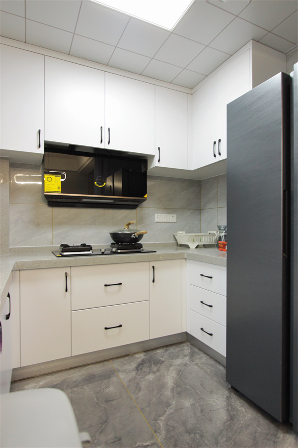 開放式廚房,灰色+木色的搭配溫和又自然,整體干凈簡約不失格調。廚房是U型的布局,白色的地柜+吊柜搭配大理石臺面,同時把冰箱也納入廚房,增強了廚房里的收納能力。