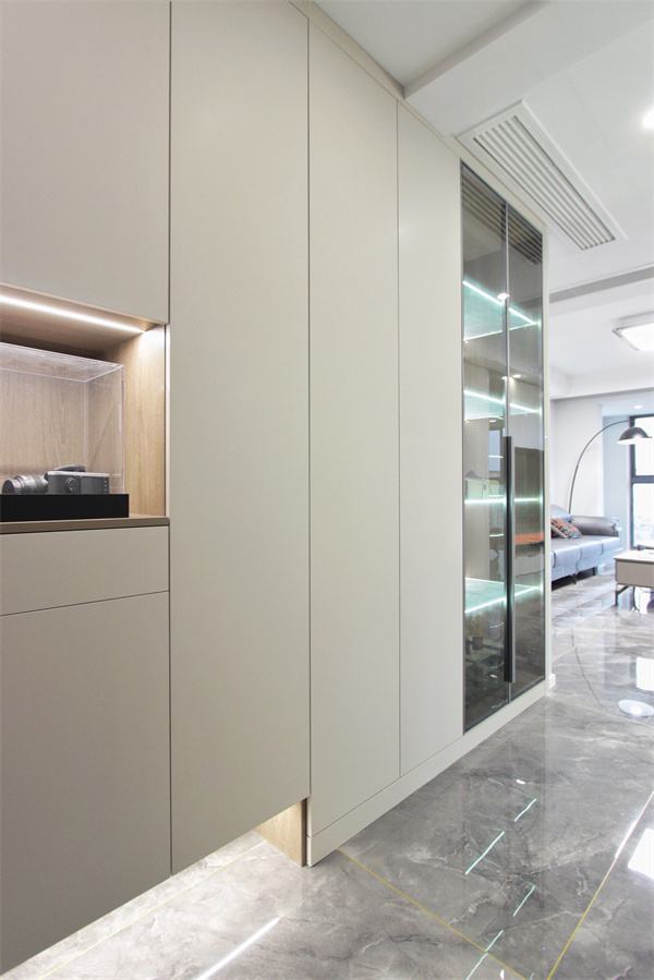 玄關用通頂的組合柜,嵌入玻璃柜,打造步入式玄關區,集展示收納于一體,讓入戶區域更顯別致大氣。玄關柜中部鏤空形式加入燈帶設計,放置一些生活物品、裝飾物,更加方便舒適,底部留空設計便于放置鞋子。