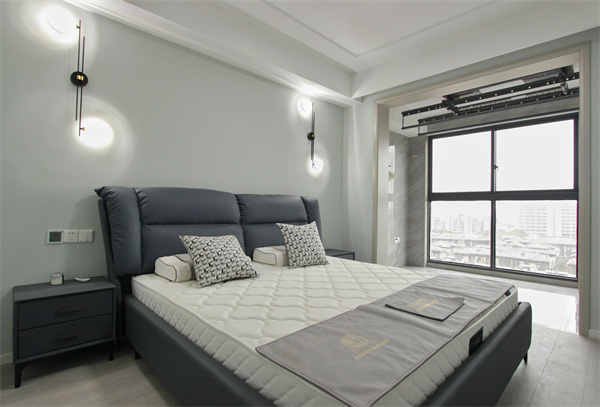 主臥以灰色為主調,淺色原木地板做依托,極自然的空間打造了冷靜優雅的氣氛。灰色系床品結合吊燈烘托,帶來一個減壓舒適的睡眠環境。