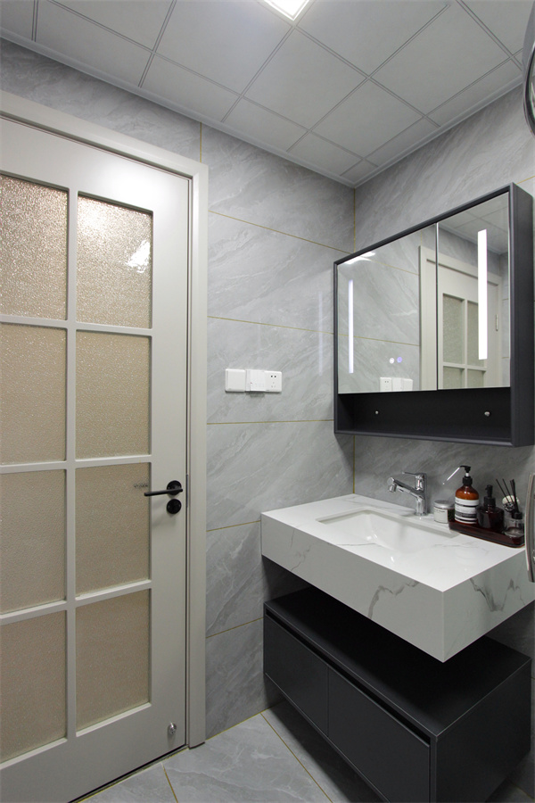 黑色浴室柜結合大理石洗手盆臺面,顯得清爽、整潔,不僅美觀還增加了收納功能,整體帶有一種比較低調的優雅質感。灰色系衛生間綴以金色美縫,兩色系形成對比,有一種高雅的格調,濕區用通透的玻璃來分隔,有效的隔絕了水汽,扇形的設計更是節省了占用空間。