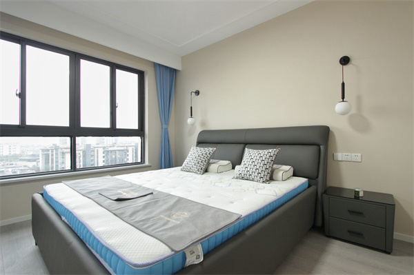 采光充足的臥室區域,將功能與顏值融為一體,奶油色墻結合深灰色床品,簡約隨性,帶來安靜、柔和又舒適的生活氛圍。木色溫馨雅致,灰色質感百搭,加以一抹藍色,用經典色系演繹舒適簡約的居住空間。
