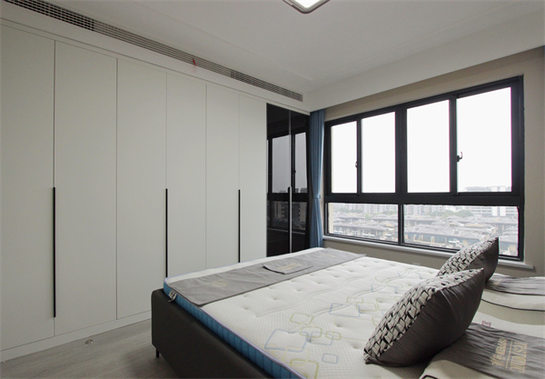 次臥的對面墻做了通頂衣柜,留出一面黑色玻璃柜作為展示,整體收納空間強大,也營造了一種高級輕奢感。