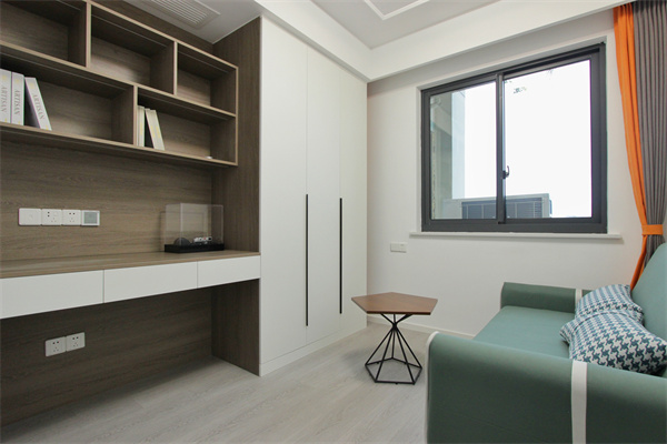 為了使空間顯得更明亮和便利一些,綠色系沙發、橙灰兩色窗簾,搭配五邊形木質桌,時尚感十足,累了可以坐在上面看看書或雜志,曬曬太陽也是極好的。書房設置了書桌與書架連體收納柜,帶來了充裕的收納空間,也讓主人在家工作或游戲都提供了舒適輕松的位置。