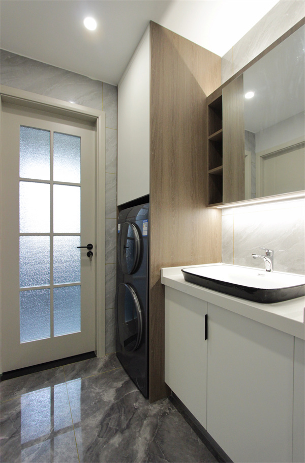 客衛洗手盆搭配燈帶,舒服雅致,相比于鏡子,鏡柜的設計更加實用,內部柜體可以收納洗漱用品,顯得衛生間干凈而整潔。衛生間做了干濕分離設計,洗衣機和烘干機采用上下疊放的方式,原木色的收納柜顯得干凈又清新。
