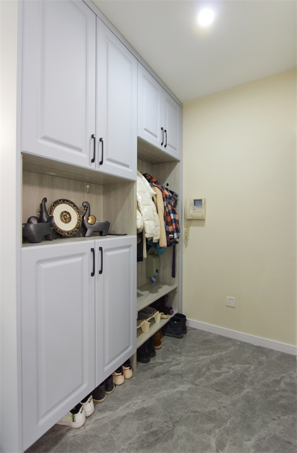 進門就是玄關,定制的玄關柜,兼顧鞋柜和衣柜的功能,儲物空間充足。