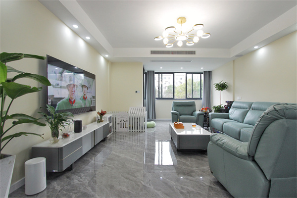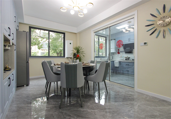 屋主家有一條可愛的狗狗,所以在客廳靠近陽臺的位置為它安置了一個小窩。陽臺劃分了一部分納入客廳,整體光線通透。因為養狗的緣故,客餐廳地面通鋪大理石瓷磚,更是耐刮耐磨,方便狗狗在家隨性奔跑。