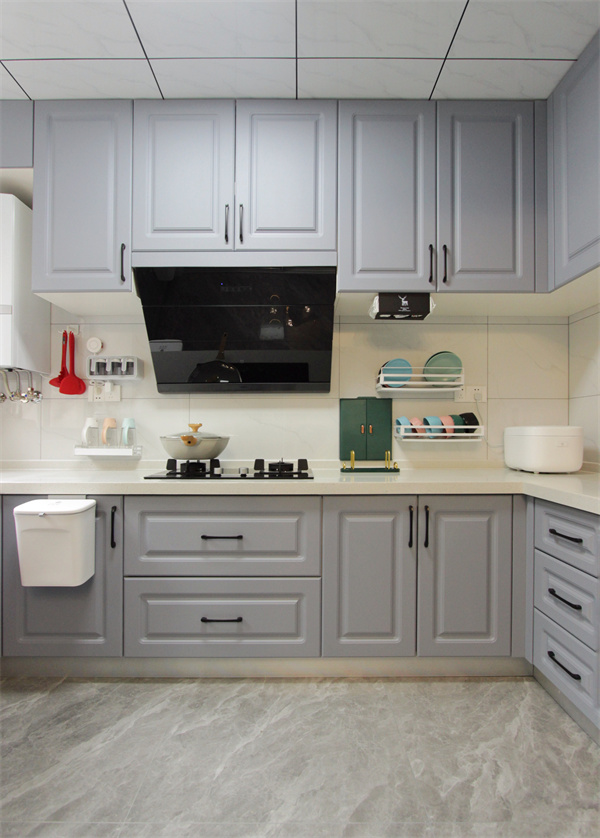 U型布局的廚房,盡可能多的增加了收納空間。內嵌入式的電器設計,上方空出的部分正好做了儲物,功能性強也可以增加收納。從左向右是洗-切-炒的使用動線規劃,使用起來更加流暢。