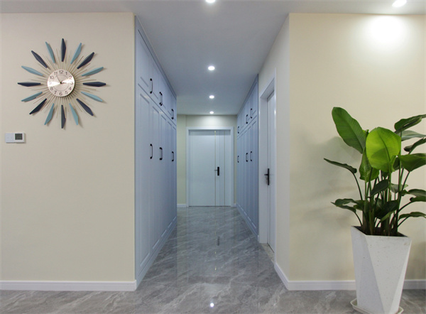 過道兩邊的定制柜,雖然簡單,但是增添了收納功能和空間層次感。