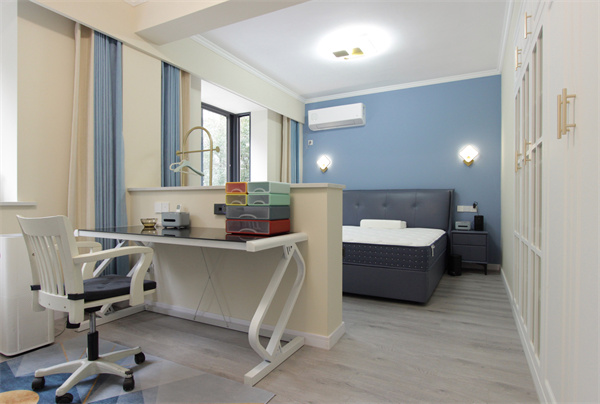 主臥以暖黃色為主色調,藍色背景墻的點綴,給人營造一種舒適的氛圍。從臥室看向書房,簡單清爽,整個空間看起來寬敞了許多。