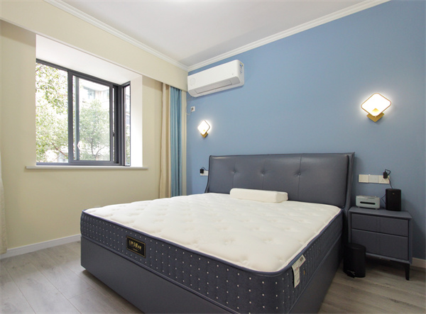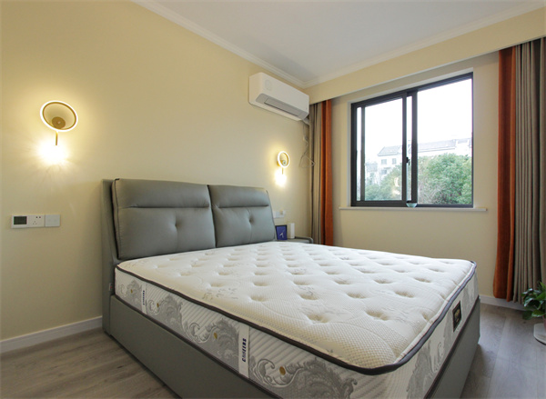 在色彩方面延續整體空間色調,側重于暖黃色的使用。床頭柜上的小愛音箱很輕盈玲瓏,早上聽一首自己喜歡的歌曲,開啟美好的一天。次臥做了一組高柜,白色柜體搭配金屬拉手,簡約時尚。