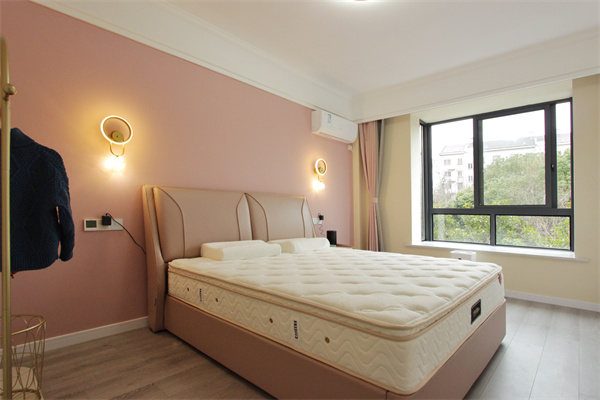 屋主把家里采光最好的空間留給了女兒,由此可見對女兒滿滿的寵愛。淡粉色的皮床與背景墻相呼應,壁燈暖色燈光的點綴,讓整體更加溫馨。女兒房主要粉+暖黃配色,馬卡龍色系天生夢幻的畫風。