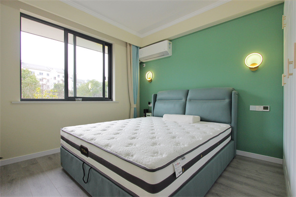 男孩房是暖黃+綠色,清新又活潑的色彩,人的心情也輕快了起來。墻面、窗簾及床,都是清新的藍綠色系,不同飽和度的色彩搭配起來更加耐看。一整面的定制衣柜,收納空間很充足。