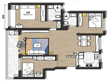 整個戶型南北通透,引自然光線入室,使客廳、餐廳共處一個開闊的空間,打造通透的開放式格局。合理考慮空間收納,運用轉角位、小空間,從而提高室內容積率。設計師對精裝房的裝修風格進行重新設計,實現了精裝房的完美蛻變。