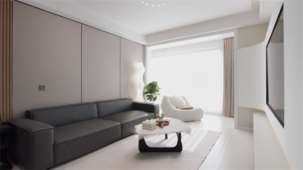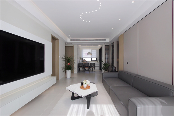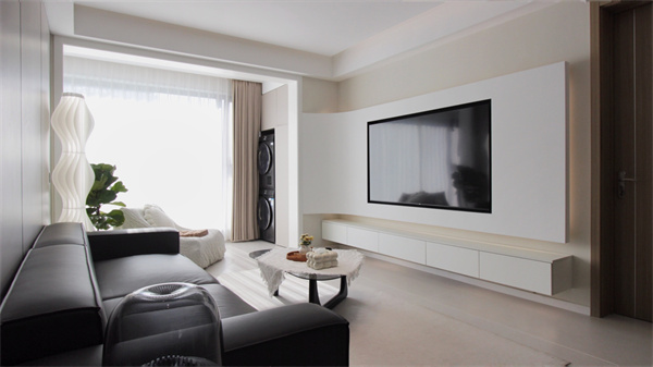 電視背景墻是整個空間的一大亮點,做弧形設計,圓潤的曲線代替尖銳的方角,使空間的氛圍感更加溫柔浪漫。弧形石膏電視背景墻,創造“懸浮”既視感,上下內嵌燈帶,簡約且高級。一字型懸空電視柜不占地,基本上不會留下衛生死角,掃地機器人可以自由出入進行清掃,讓客廳空間時刻保持干凈整潔。