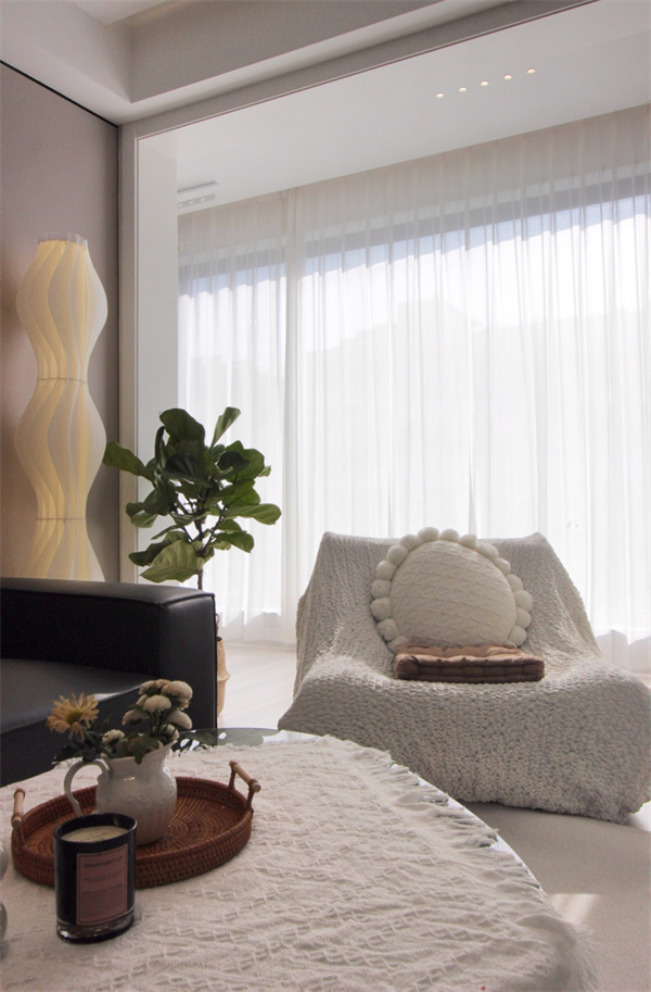 沙發背景墻采用三塊飾面板進行鋪裝打造,并輔以格柵裝飾,顯示出溫潤自然的底色。咖色的地毯、玻璃花瓶和花束、簡易的落地燈還有一張簡易茶幾,每一個細節都透出奶奶的氛圍感。