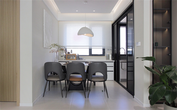 客餐廳整體采用開放式的格局設計,相連的空間讓視覺效果更顯開闊大氣,也更具有融通性。頂面采用無主燈設計,運用筒燈做s型光源,制造出簡潔大氣的空間效果。