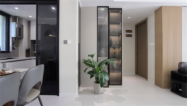另外在玄關處打造了一組玻璃酒柜,柜體內的燈光讓整個酒柜內的物品一目了然,增強了空間的裝飾感與層次感。