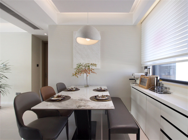 選用詫寂風奶油吊燈,微水泥材質設計,其細膩肌理與暖調燈光相遇時,為空間增添不少氣氛,真正實現美與生活的平衡。巖板桌面賦予了餐敘空間一抹高端的氣質,再加上適時更換的綠植,餐敘之時也能幸福感滿滿。