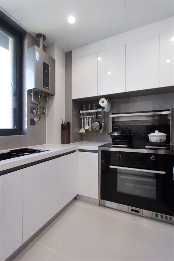 L型廚房布局設計,讓“洗切炒”動線更合理,取物、洗滌、備餐、烹飪.....一氣呵成。同時采用蒸烤一體集成灶,成功地解決了屋主家人所擔憂的油煙問題。