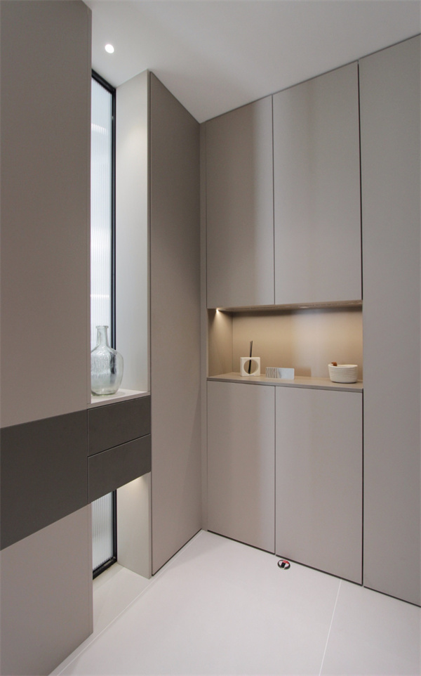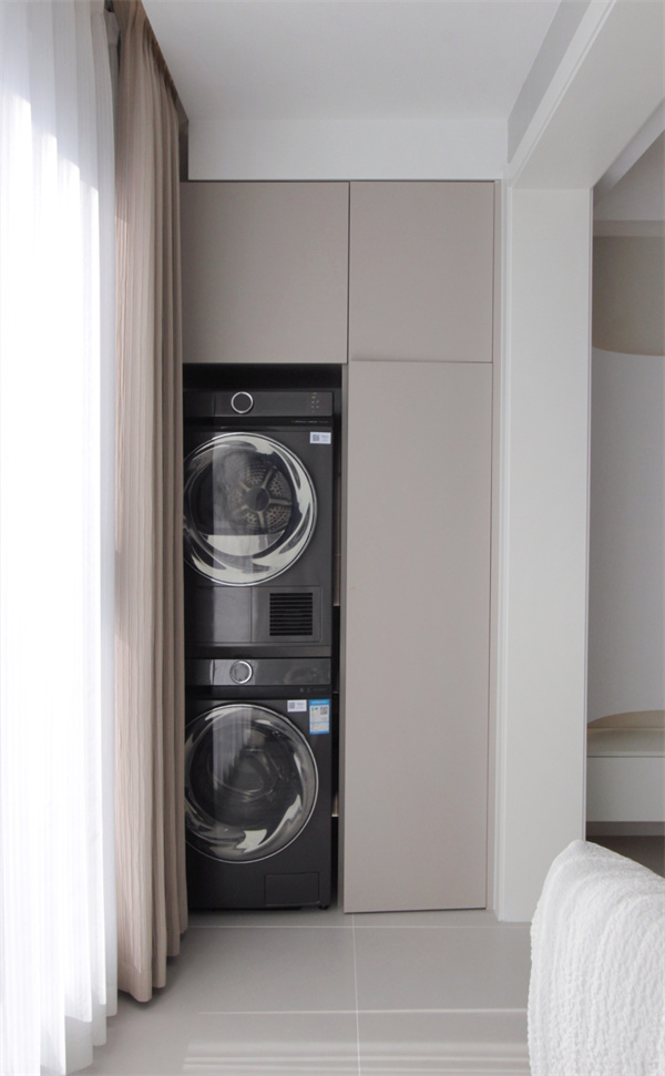 陽臺空間合理規劃,定制收納柜,將洗烘機疊放內置其中,既保持空間干凈整潔,也能滿足業主一家日常雜物的儲物需求。