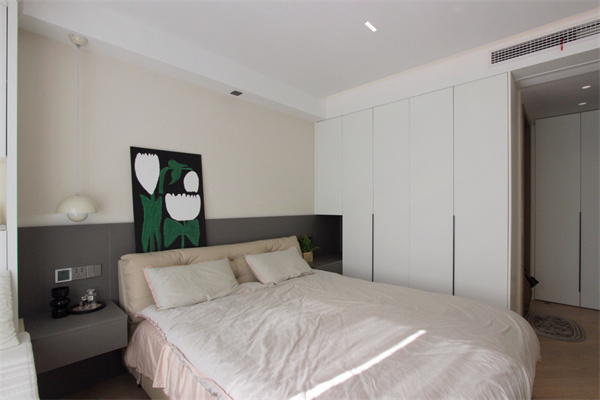 來到主臥,背景墻分為奶咖色和灰色上下兩部分,來增強空間的層次感,奶呼呼的靠背雙人床,搭配一體化的懸空式床頭柜,簡約中又不失精致。床尾擺放梳妝臺,方便女主人每天早上護膚、更衣、梳妝。