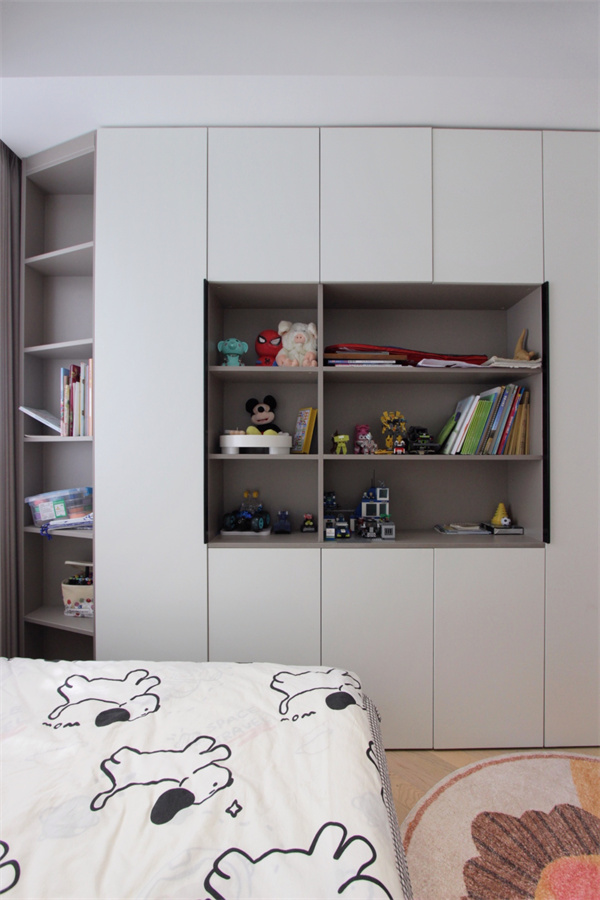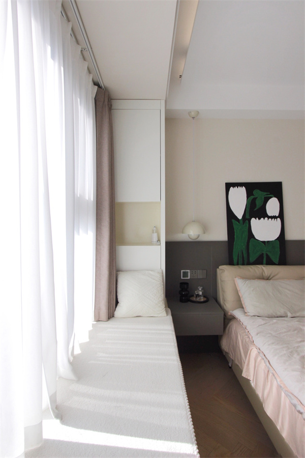 飄窗打造成休閑區,加上軟墊與抱枕,讓空間多出舒適氛圍。飄窗右側還定制了一列收納柜,放置書本、玩具正合適。