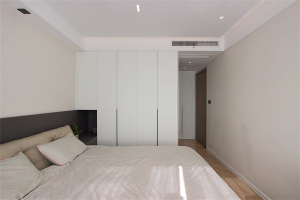 定制收納衣柜,大大提高空間收納力,并且在衣柜延伸出床頭置物區,不僅提高了睡眠區的隱私性,還代替了傳統床頭柜,一體化的設計讓主臥更顯干凈、利落。同時在主臥門后空間也做了一組通頂衣柜,上部收納換被褥,下部收納當季衣物,從而進一步提高空間利用率。