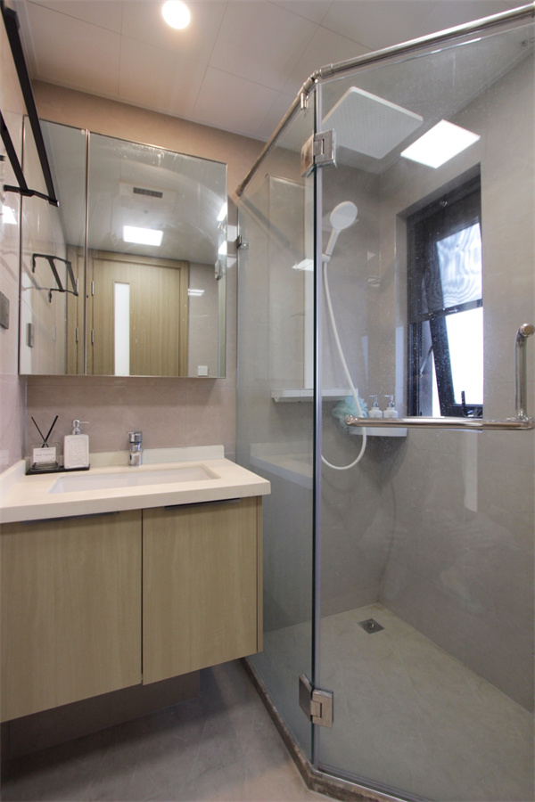 主衛選用浴室柜+鏡柜的組合設計,滿足衛生間的收納需求。鏡柜用來放瓶瓶罐罐,浴室柜則用來收納一些備用的洗浴用品。整體采用干濕分離設計,不僅可以保持衛生間室內的干燥,還可以避免潮濕的室內滋生細菌。