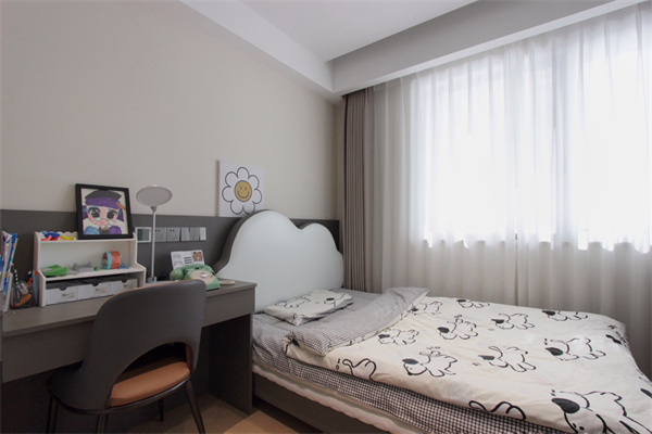 兒童房與主臥裝修采用相同手法,背景墻分成上下兩部分,起到很好的呼應作用。云朵造型床頭,加上童趣感床品,讓室內洋溢著可愛溫馨的氛圍。床側配備灰色書桌,加上精致的擺飾品與讀物,為小主人提供了實用舒適的學習與睡眠環境。