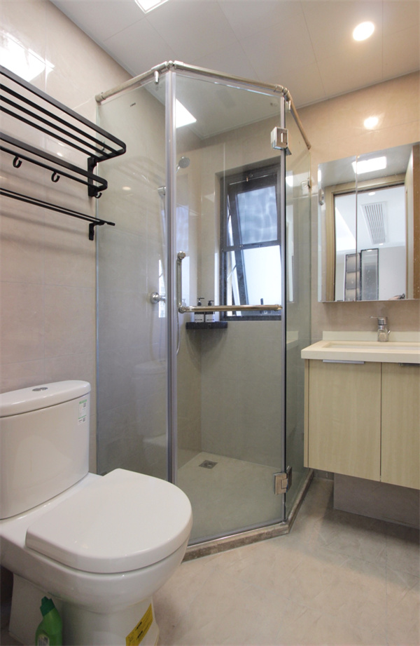 客衛的整體設計與主衛保持了統一,原木色浴室柜、馬桶、淋浴間,淺色墻磚讓空間更顯通透明亮。淋浴間安裝不銹鋼壁龕,加強防水功能,可放置日常洗浴用品。馬桶上方的毛巾架,方便安置毛巾、換洗衣物等。