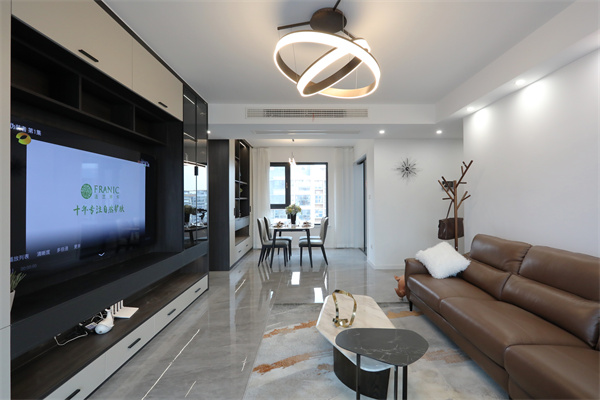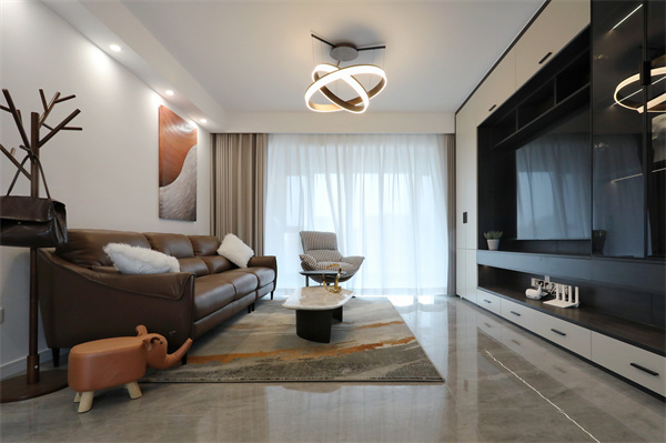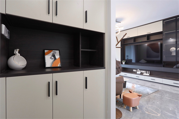客廳是室內(nèi)空間的門面,電視背景墻以柜為主,黑白結(jié)合,虛實相對,空間中的線面結(jié)合,提升了整體的層次感和藝術(shù)美感。